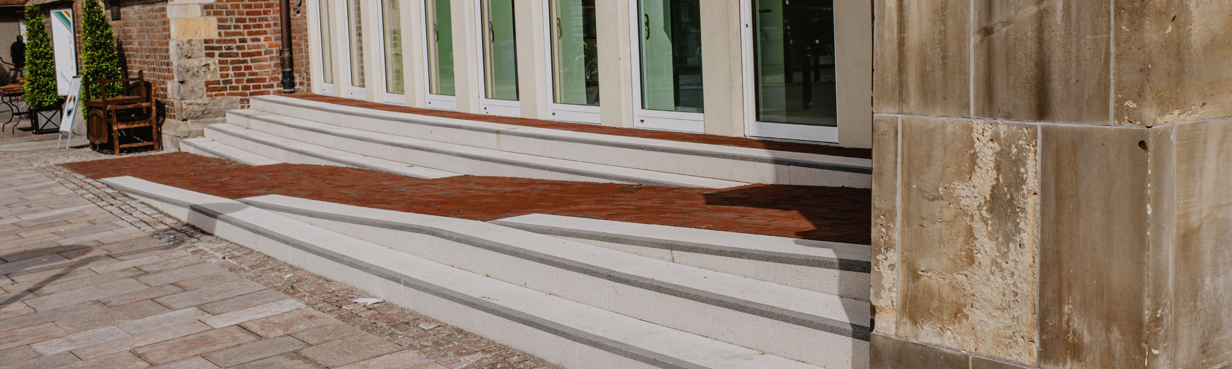 Bei diesem öffentlichen Projekt ging es um die Treppengestaltung des alten Rathauses (FARB) auf dem Marktplatz in Borken. Das Projekt wurde vollumfänglich von uns geplant und umgesetzt. Besonderheiten sind die Betonblockstufen, maßgefertigten von der Firma Rinn, die sich passgenau an die vorhandenen Sandsteinsäulen anfügen. Auch die Naturstein- und Klinkerriemchenpflasterung erfolgte durch unser Team.