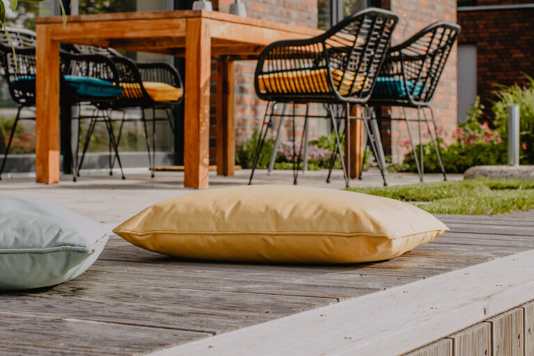 Bei der erhöhten Terrasse im Garten dieses Coesfelder Einfamilienhauses wurde ein Teilbereich als Sonnendeck mit sibirischer Lärche ausgearbeitet. Die Betonplatten stammen von der Firma Klostermann, also direkt aus Coesfeld. Zur Abführung des Regenwassers wurde eine Versickerungsmulde mit Sicherschacht installiert. Lebhafte Staudenpflanzungen runden den grünen Gesamteindruck der Neugestaltung ab.