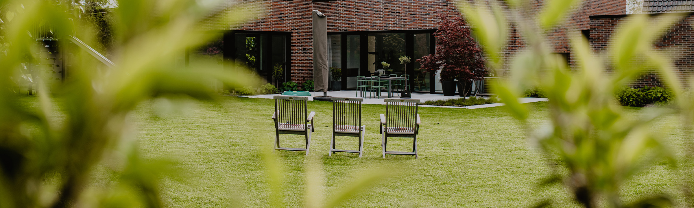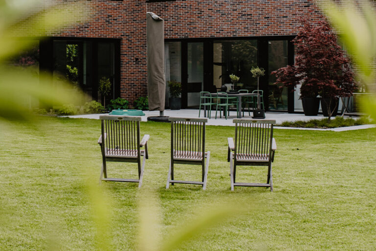 Dieser Neubaugarten in Rosendahl Holtwick zeichnet sich durch seine großräumige Flächengestaltung aus. Dazu passen die großformatigen Sichtbetonplatten Massimo light (100 x 100 cm) von Klostermann, die bei der Terrasse zum Einsatz kamen. Der rote Fächerahorn ist das zentrale Element der Hauptterrasse und farblich ein echter Blickfang. Die große Rasenfläche (ca. 600 m2) wird durch ein Bewässerungssystem und einen Rasenroboter automatisch gepflegt. Bei der Bepflanzung setzten wir flächig Schneeballhortensien ein, um die minimalistische und puristische Gesamtoptik zu unterstreichen.