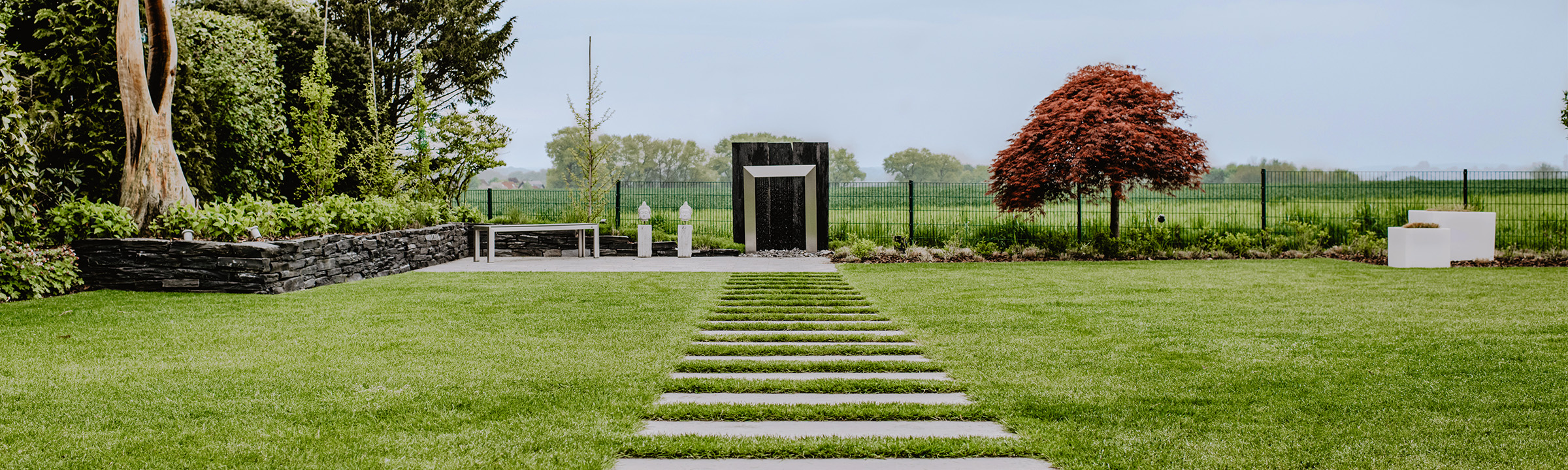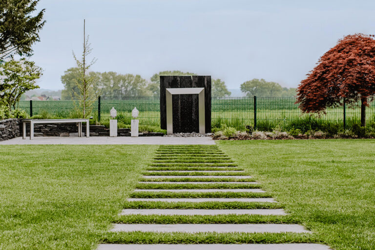 Dieser Neubaugarten in Nottuln zeichnet sich durch seine minimalistische Gestaltung aus. Dadurch greift der Garten die klaren Linien der Architektur des Hauses auf. Farblich abgestimmt wurden großformatigen Keramikplatten (120 x 60 cm) verwendet. Mit Einsetzen der Dämmerung werden die hinterleuchteten Milchglaselemente ein echter Blickfang. Stil hat auch die dunkle Schiefertrockenmauer. Auf der technischen Seite kommen ein modernes Bewässerungssystem und ein Mähroboter zum Einsatz.