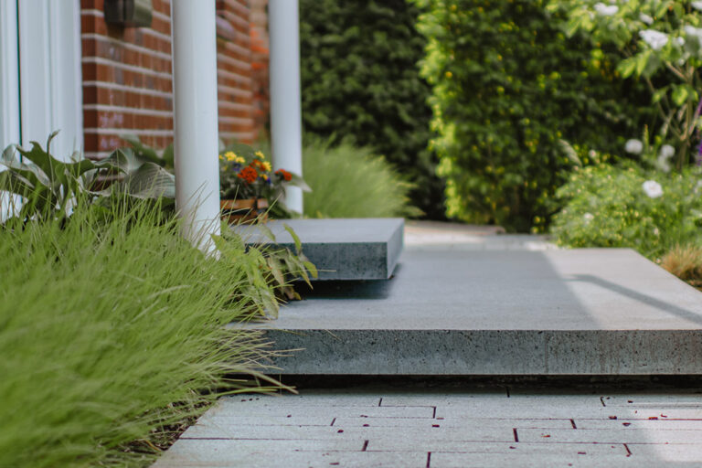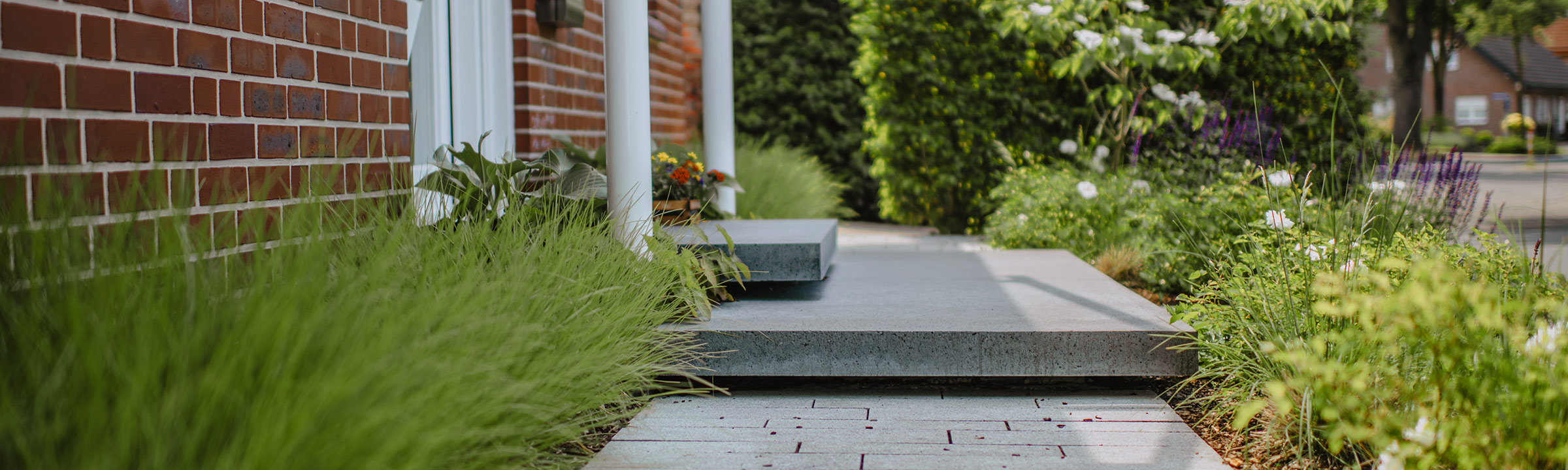 Die schwebend verbauten Sichtbetonsteinstufen auf dem Weg zur Haustür sind das auffällige Merkmal dieses komplett neu gestalteten Vorgartens. Die Stufen aus anthrazitfarbenen, porigen Platten von Schellevis werden teils mit LED-Streifen unterleuchtet. Das trägt nachts zur Trittsicherheit bei und unterstreicht den schwebenden Charakter der Stufen. Auch die kräftigen Beeteinfassungen stammen aus dem Sortiment von Schellevis und passen optisch gut in die Gesamtgestaltung. Die Wege verlegt mit einem Klostermann Pflaster runden das Gesamtbild ab.