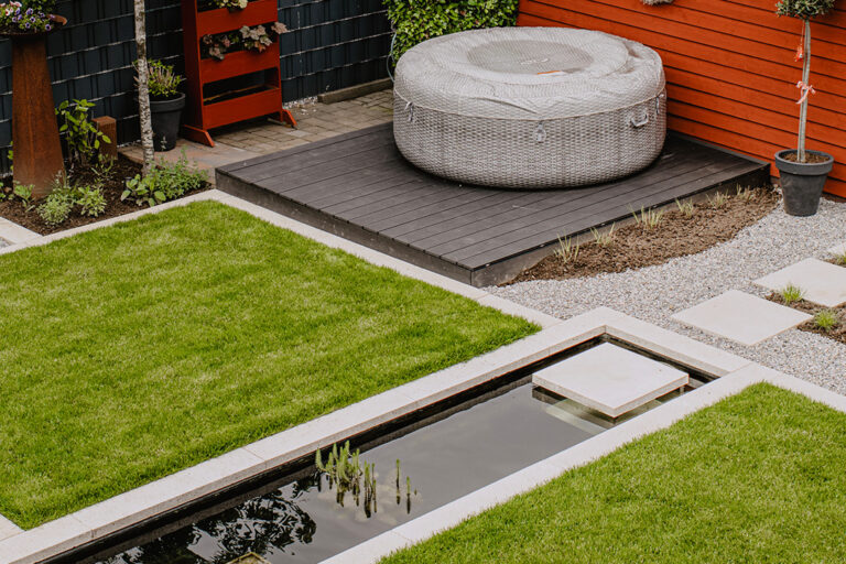 Bei diesem Garten in Coesfeld stand das Thema Wasser im Vordergrund. Dazu installierten wir ein Wasserbecken mit einer Edelstahlwasserschütte, sowie Belägen und Einfassungen aus Schellevis Betonstein in der Farbe Creme. Daneben errichteten wir ein Holzdeck für Integration eines Jacouzzi. Die Trittplatten brechen die Grenze zwischen Rasenfläche und Wasser, in dem sie bis in das Wasserbecken hineinlaufen. Zum Entspannen gibt es zwei Sitzplätze, einen mit Strandkorb, sowie einen weiteren mit Feuerkorb für gemütliche Abende.
